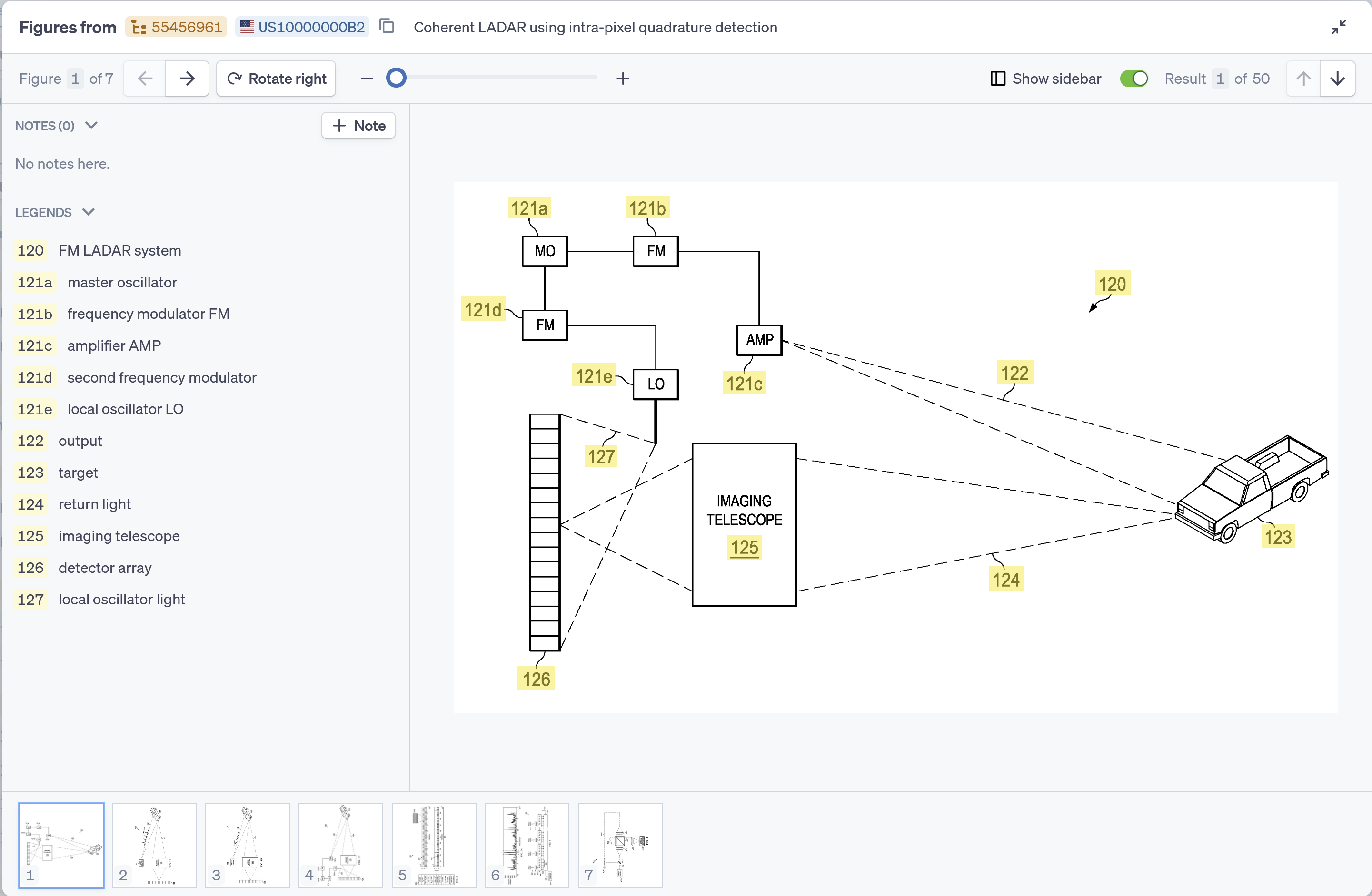 Similar to the right pane in “Results” view, the “Figure Popup” highlights element numbers in the figures which when hovered over shows the associated element name from the publication text. In addition to hovering over the element numbers, the user has the option to toggle legends off or on. When toggled on, the legends will show a list of element numbers and the associated element names. The user can hover over an element in the legends and the element in the figure will then highlight in blue to show where this element exists in the figure.