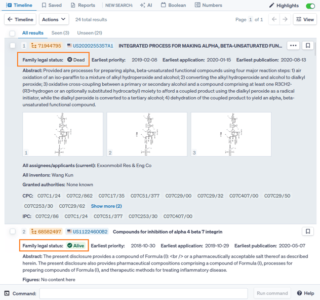 In Results view, the family legal status is shown immediately below the DOCDB family number and representative publication number.