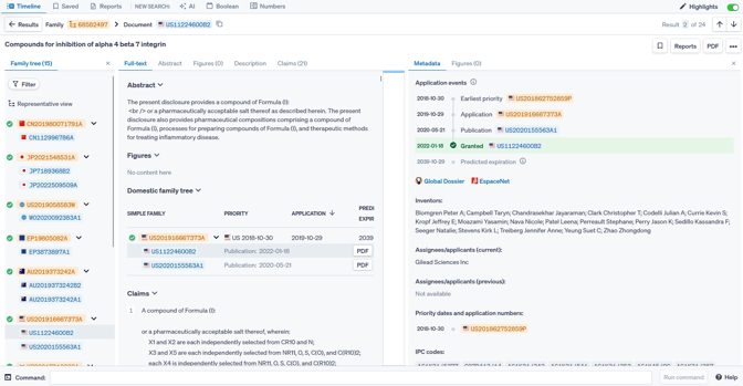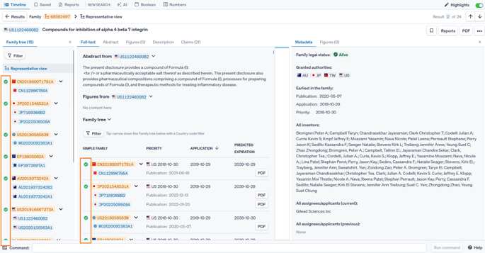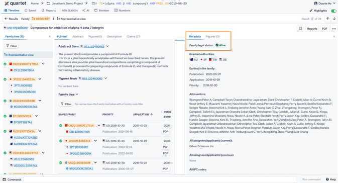 The Metadata tab shows family legal status of the selected publication. If Representative view is selected from the Family tree, then the Family legal status will be shown. If a specific publication is selected, then the legal status as well as a list of Application events will be shown.