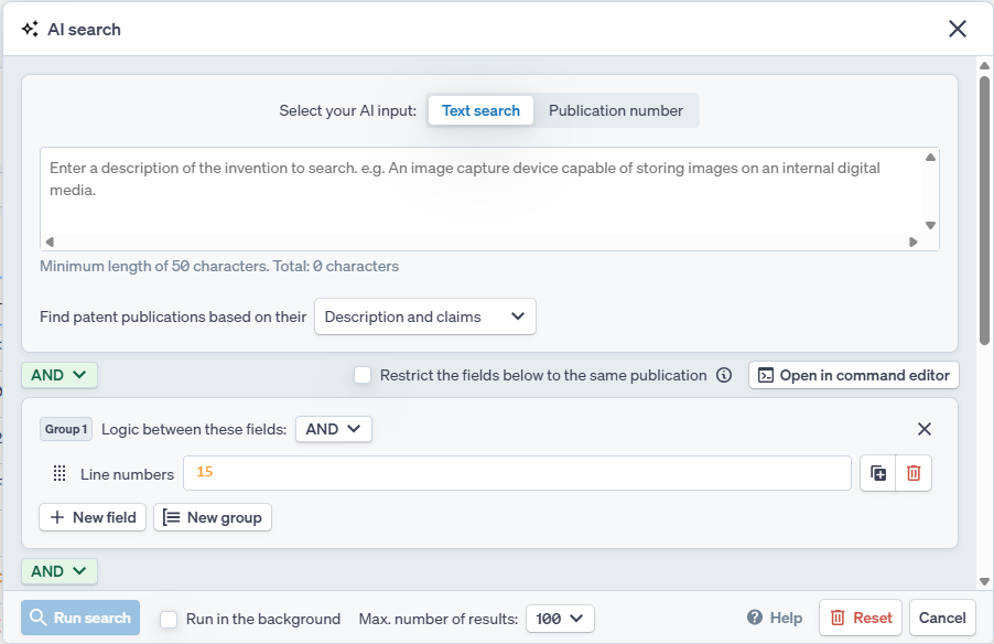 From here, enter the desired AI query, select the maximum number of results, and Run search.