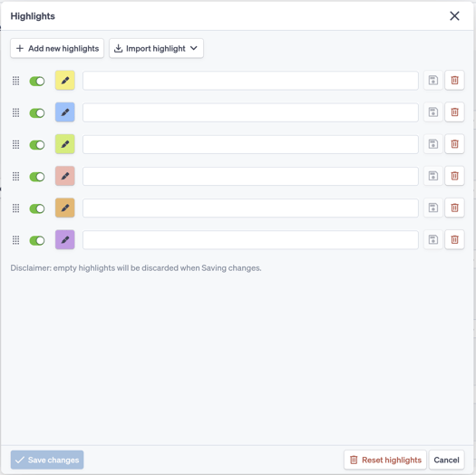 Clicking “Highlights” in either Results view or Detail view will bring up the “Highlights” popup box. In this box, the user can input keywords or phrases they wish to highlight and select the desired highlighting color.