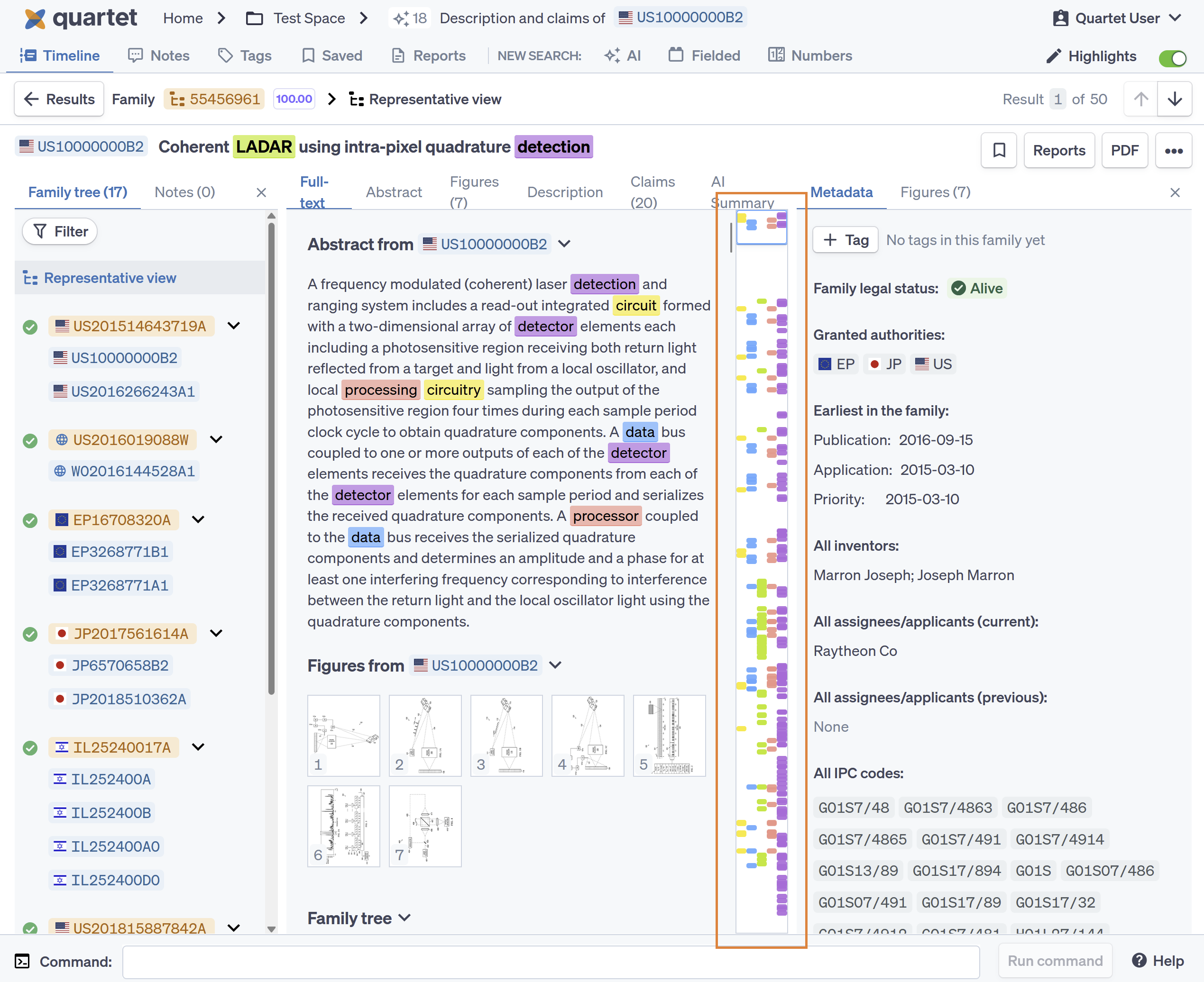 In Detail view, a highlight Minimap is placed between the center pane and right pane. The Minimap shows where and how frequently within the document highlights are present. Using the Minimap, the user can quickly see whether each specific highlighted idea may be described by the document and where they need to scroll to see the highlighted text.