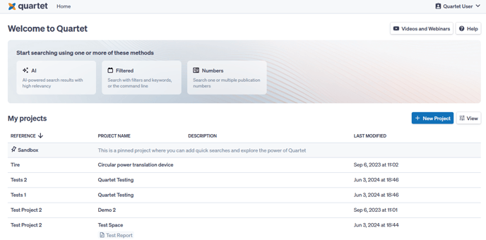 The Home page shows all of a user's projects. When a user begins searching, they must either create a new project or select an existing project.