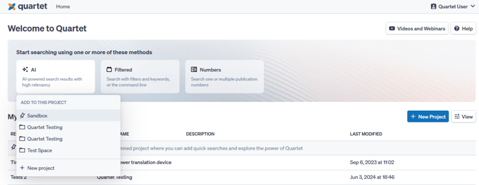 The user can click these buttons to jump to that search method. When clicking a search method button, a drop down menu will prompt the user to add the search to the Sandbox, a listed recent project, or to create a new project.