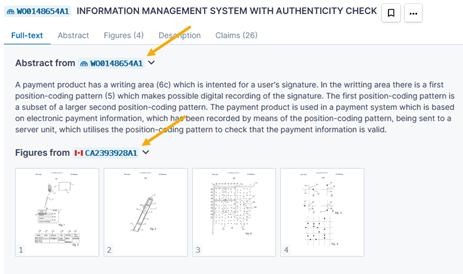 In general, selection of the representative member to display is determined by a background set of rules; however, if the system’s first-choice document is missing a field, the missing field will be pulled and displayed from another family member. An example of this can be seen in the family for document WO 01/48654 A1. The WO document does not have figures, so they are pulled in from the CA family member instead.