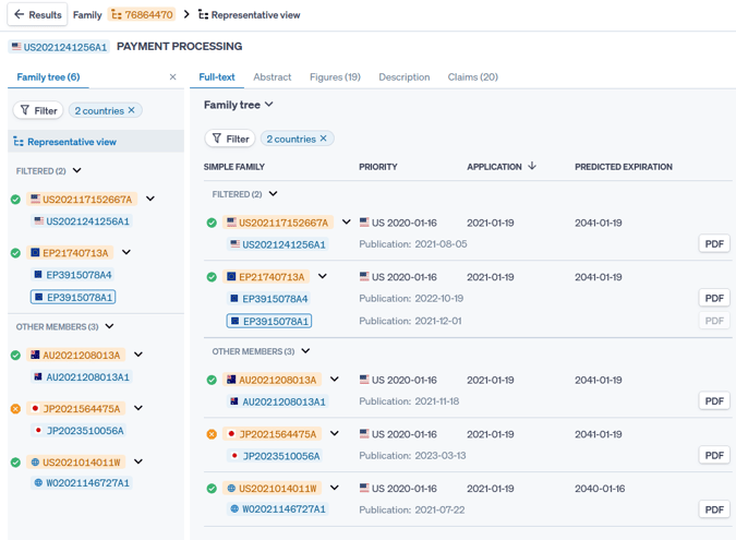 - "Granted authorities" will show all jurisdictions in which a patent has been granted in the family.