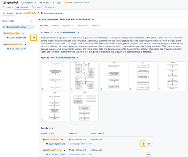 The “Manage reports” pop-up allows the user to select the applicable reports to which the publication is to be saved. The user can also create new reports in this pop-up. Once saved, any publications of a family which have been saved to a report are indicated by an icon in both the Family Tree in the left column and the expanded Family Tree in the Full-text tab