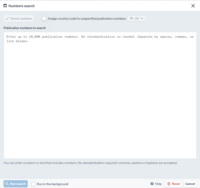 Numbers Search allows a user to enter publication numbers to pull a set of results. Currently the system supports a large number of formats within the 6 largest jurisdictions: US, WO, EP, CN, JP, and KR; additional jurisdictions are supported but may not have as much flexibility in recognizing obscure or nonstandard number formats.